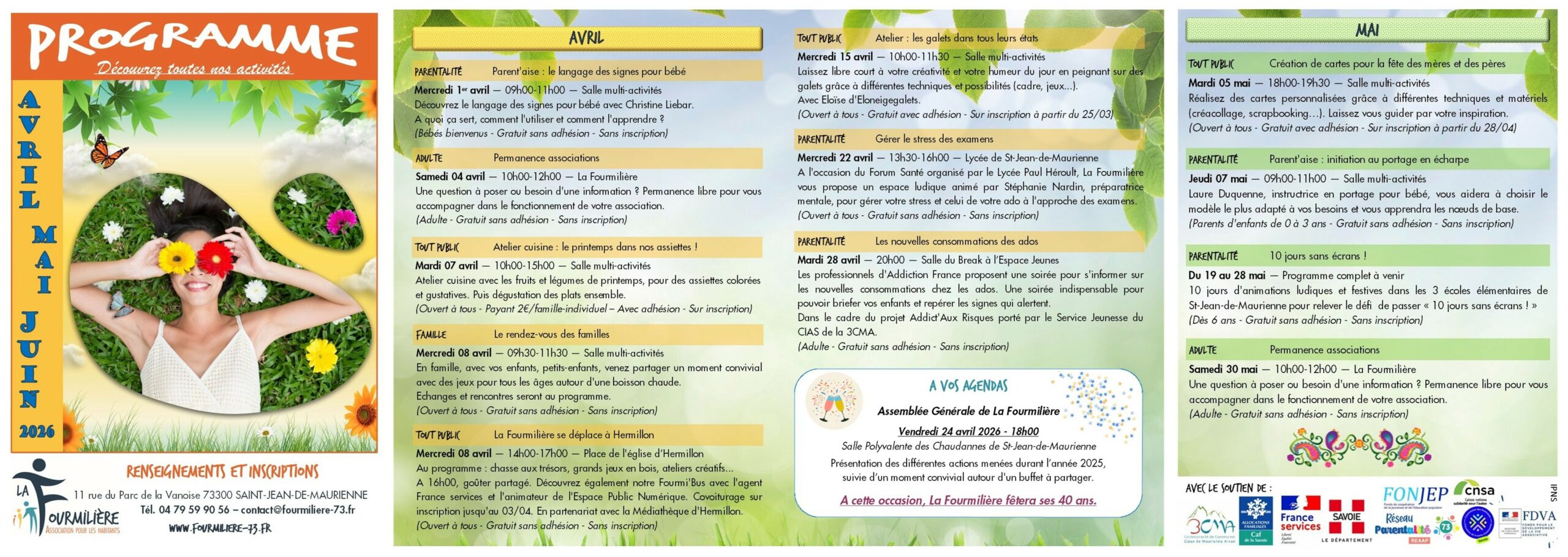 Découvrez les activités proposées par La Fourmilière pour les mois d’avril, mai et juin 2026 : ateliers cuisine, créations diverses, rendez-vous des familles…