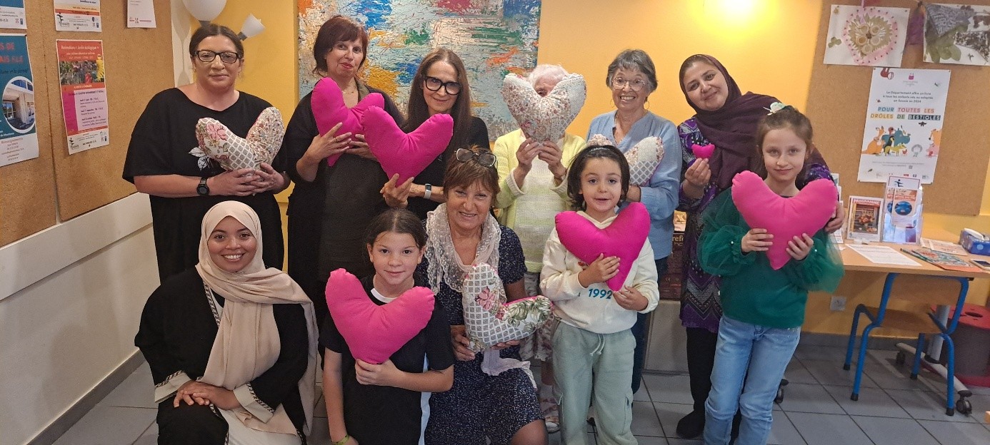 Samedi 11 octobre, 11 personnes dont des enfants âgés de 6 à 10 ans, sont venues confectionner des « Coussins Cœur » dans le cadre de la lutte contre le cancer du sein pour Octobre Rose.