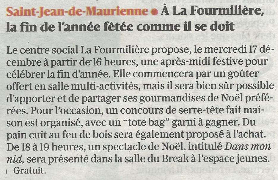 Découvrez les articles de presse du mois de décembre 2023 qui relatent les activités de La Fourmilière.